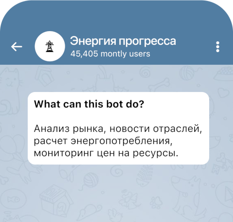 Бот предоставляет аналитику по энергетике, данные о проектах и инвестициях, а также помогает с расчетами энергопотребления.